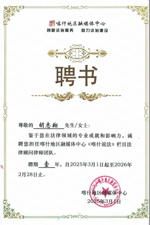 近日,新疆正嘉律师事务所的律师团队受聘成为喀什地区融媒体中心《喀什说法》栏目的法律顾问。喀什地区融媒体中心《喀什说法》栏目组向新疆正嘉律师事务所进行授牌,并向胡志翔主任颁发聘书。